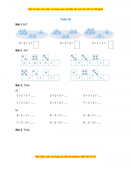 Tuần 16 Bài 1.Số? 4 + 2 + 1 = 3 + 2 + 2 = 5 + 1 + 1 = Bài 2. Số? Bài 3. Tính: a) 1 + 1 + 1 = ….. 2 + 2 + 1 = …. 5 + 1 + 1 = …. 1 + 1 + 2 = ….. 2 + 1 + 3 = …. 7 + 1 + 2 = …. b) 4 – 1 – 1 = ….. 8 – 3 – 1 = …. 5 – 4 – 1 = …. 7 – 2 – 2 = ….. 9 – 2 – 3 = …. 6 – 3 – 3 = …. Bài 4. Tính: