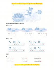 ĐÁP ÁN VÀ HƯỚNG DẪN GIẢI Bài 1. Số? 4 + 2 + 1 = 7 3 + 2 + 2 = 7 5 + 1 + 1 = 7 Bài 2. Số? Bài 3. a) 1 + 1 + 1 = 3 2 + 2 + 1 = 5 5 + 1 + 1 = 7 1 + 1 + 2 = 4 2 + 1 + 3 = 6 7 + 1 + 2 = 10