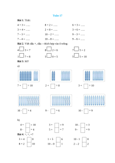 Tuần 17 Bài 1. Tính: 4 + 3 = ….. 8 + 2 = ….. 6 + 3 = ….. 3 + 4 = ….. 2 + 8 = ….. 3 + 6 = ….. 7 – 3 = ….. 10 – 2 = ….. 9 – 3 = ….. 7 – 4 = ….. 10 – 8 = ….. 9 – 6 = …..