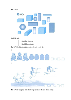 Bài 2. Viết dấu +, dấu – thích hợp vào ô trống: 4 3 = 7 8 2 = 6 7 5 = 2 1 7 = 8 5 0 = 5 5 5 = 10 Bài 3. Số? a) 7 + = 10 2 + = 8 3 + = 10 10 - = 4 9 - = 6 10 - = 9 b) 4 + = 10 3 + = 9 10 - = 3 8 - = 4 5 + = 7 9 - = 9 Bài 4. >, <, =? 3 + 4 8 1 + 5 6 10 - 1 0 8 + 2 10 10 – 0 1 2 – 2 2 Bài 5. Số? Hình bên có: Khối lập phương Khối hộp chữ nhật