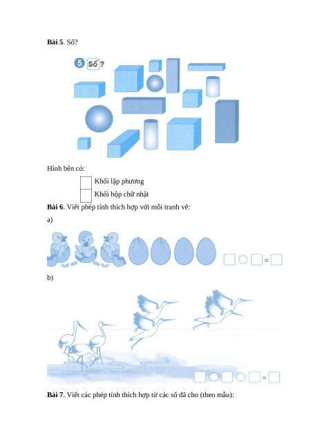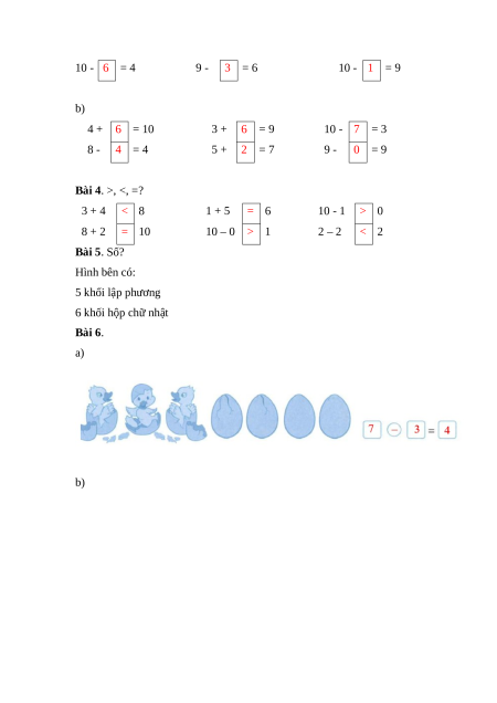 5 – 0 = 5 hoặc 5 + 0 = 5 5 + 5 = 10 Bài 3. Số? a) 7 + 3 = 10 2 + 6 = 8 3 + 7 = 10 10 - 6 = 4 9 - 3 = 6 10 - 1 = 9 b) 4 + 6 = 10 3 + 6 = 9 10 - 7 = 3 8 - 4 = 4 5 + 2 = 7 9 - 0 = 9 Bài 4. >, <, =? 3 + 4 < 8 1 + 5 = 6 10 - 1 > 0 8 + 2 = 10 10 – 0 > 1 2 – 2 < 2 Bài 5. Số? Hình bên có: 5 khối lập phương 6 khối hộp chữ nhật Bài 6. a) b)