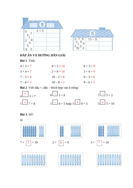ĐÁP ÁN VÀ HƯỚNG DẪN GIẢI Bài 1. Tính: 4 + 3 = 7 8 + 2 = 10 6 + 3 = 9 3 + 4 = 7 2 + 8 = 10 3 + 6 = 9 7 – 3 = 4 10 – 2 = 8 9 – 3 = 6 7 – 4 = 3 10 – 8 = 2 9 – 6 = 3