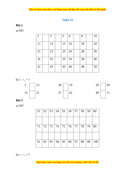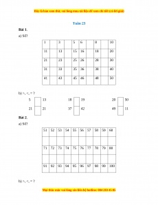 Tuần 23 Bài 1. a) Số? 1 3 5 6 8 10 11 13 15 16 18 20 21 23 25 26 28 30 31 33 35 36 38 40 41 43 45 46 48 50 b) >, <, = ? 5 13 18 19 20 50 21 21 37 42 49 11 Bài 2. a) Số? 51 52 53 54 55 56 57 58 59 60 71 72 73 74 75 76 77 78 79 80 91 92 93 94 95 96 97 98 99 100 b) >, <, = ?