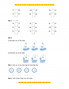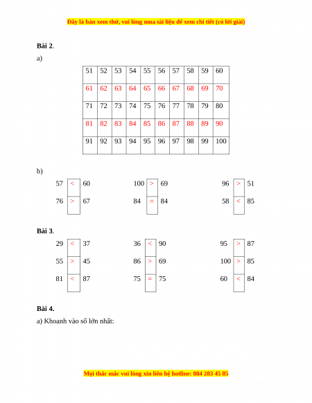Bài 2. a) 51 52 53 54 55 56 57 58 59 60 61 62 63 64 65 66 67 68 69 70 71 72 73 74 75 76 77 78 79 80 81 82 83 84 85 86 87 88 89 90 91 92 93 94 95 96 97 98 99 100 b) 57 < 60 100 > 69 96 > 51 76 > 67 84 = 84 58 < 85 Bài 3. 29 < 37 36 < 90 95 > 87 55 > 45 86 > 69 100 > 85 81 < 87 75 = 75 60 < 84 Bài 4.