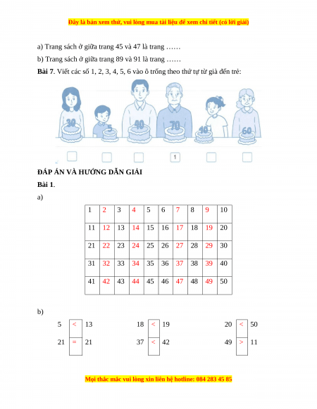 ĐÁP ÁN VÀ HƯỚNG DẪN GIẢI Bài 1. a) 1 2 3 4 5 6 7 8 9 10 11 12 13 14 15 16 17 18 19 20 21 22 23 24 25 26 27 28 29 30 31 32 33 34 35 36 37 38 39 40 41 42 43 44 45 46 47 48 49 50 b) 5 < 13 18 < 19 20 < 50 21 = 21 37 < 42 49 > 11