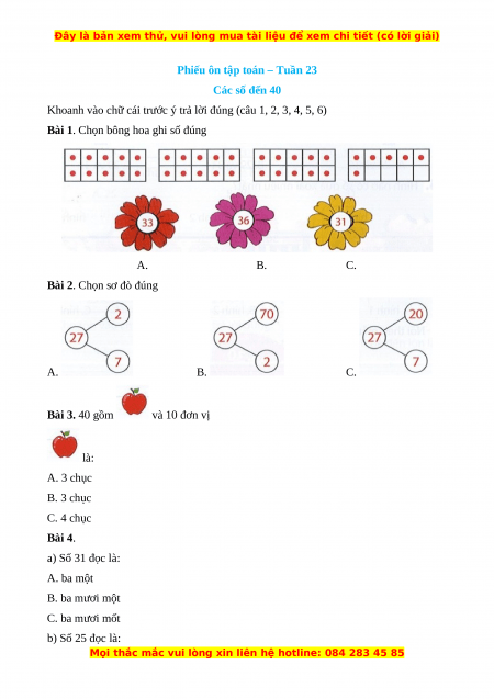Bài 2. Chọn sơ đò đúng A. B. C. Bài 3. 40 gồm và 10 đơn vị là: A. 3 chục B. 3 chục C. 4 chục Bài 4. a) Số 31 đọc là: A. ba một B. ba mươi một C. ba mươi mốt b) Số 25 đọc là: