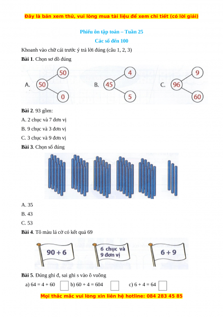 Phiếu ôn tập toán – Tuần 25 Các số đến 100