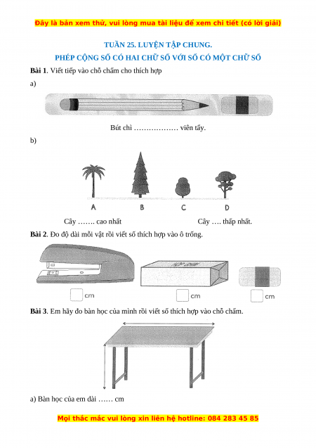 Bút chì ……………… viên tẩy. b) Cây ……. cao nhất Cây …. thấp nhất.