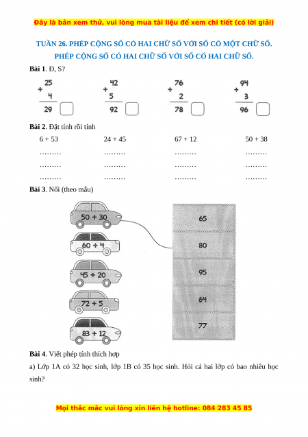a) Lớp 1A có 32 học sinh, lớp 1B có 35 học sinh. Hỏi cả hai lớp có bao nhiêu học