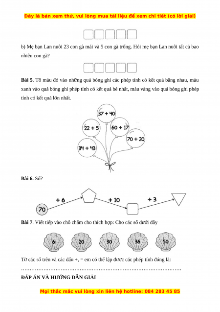 b) Mẹ bạn Lan nuôi 23 con gà mái và 5 con gà trống. Hỏi mẹ bạn Lan nuôi tất cả bao nhiêu con gà?