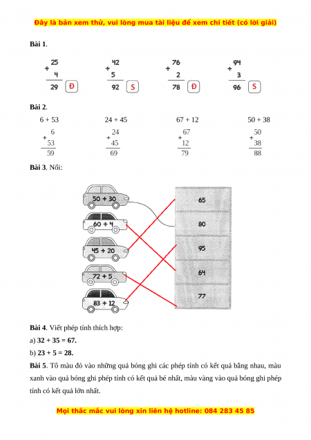Bài 4. Viết phép tính thích hợp: a) 32 + 35 = 67. b) 23 + 5 = 28.