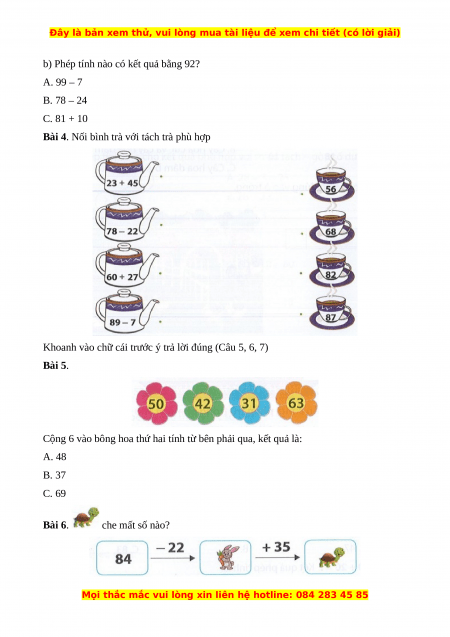 b) Phép tính nào có kết quả bằng 92? A. 99 – 7 B. 78 – 24 C. 81 + 10