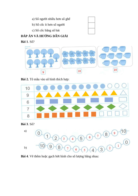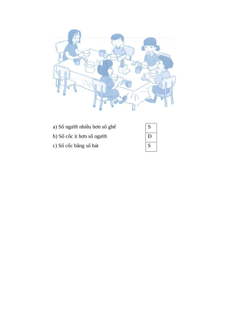 b) Số cốc ít hơn số người c) Số cốc bằng số bát