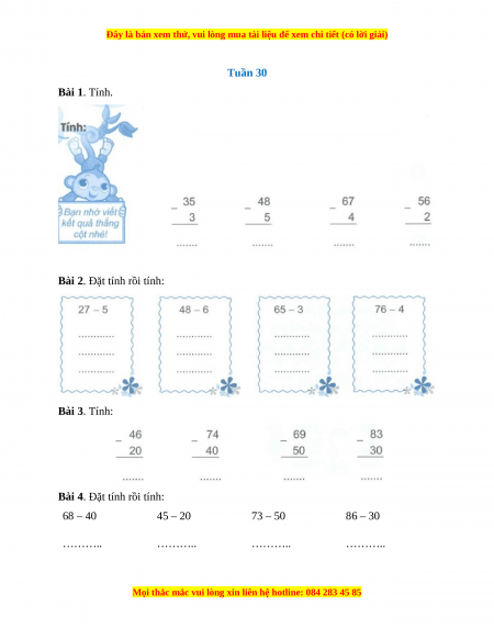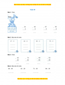 Bài 4. Đặt tính rồi tính: 68 – 40 45 – 20 73 – 50 86 – 30 ……….. ……….. ……….. ………..