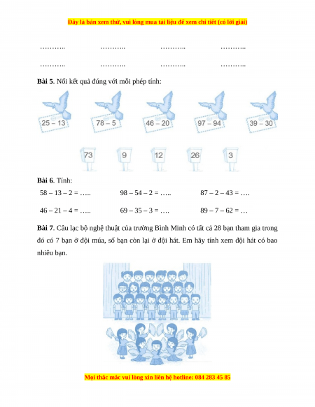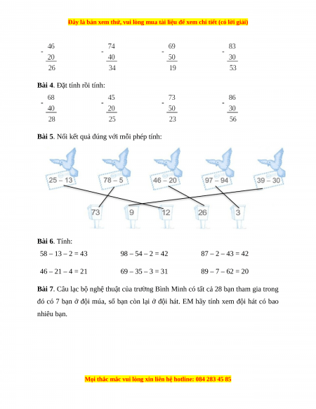 Bài 5. Nối kết quả đúng với mỗi phép tính: Bài 6. Tính: 58 – 13 – 2 = ….. 98 – 54 – 2 = ….. 87 – 2 – 43 = …. 46 – 21 – 4 = ….. 69 – 35 – 3 = …. 89 – 7 – 62 = …