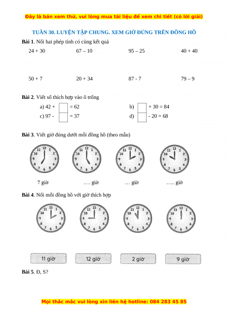 TUẦN 30. LUYỆN TẬP CHUNG. XEM GIỜ ĐÚNG TRÊN ĐỒNG HỒ
