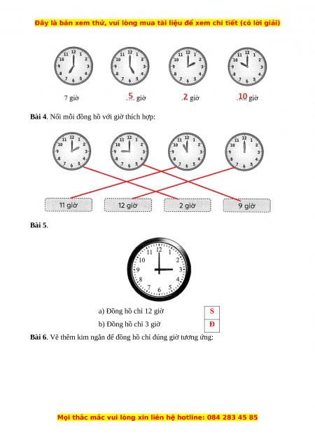 Bài 4. Nối mỗi đồng hồ với giờ thích hợp: Bài 5. a) Đồng hồ chỉ 12 giờ S b) Đồng hồ chỉ 3 giờ Đ