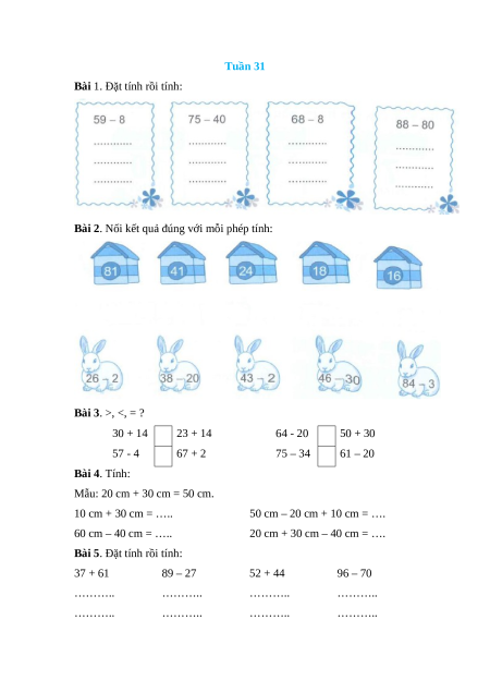 Bài 5. Đặt tính rồi tính: 37 + 61 89 – 27 52 + 44 96 – 70 ……….. ……….. ……….. ……….. ……….. ……….. ……….. ……….. ……….. ……….. ……….. ………..