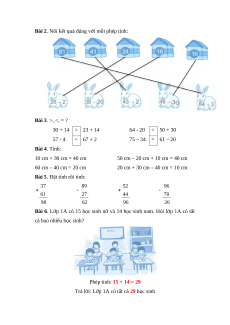 Bài 2. Nối kết quả đúng với mỗi phép tính: Bài 3. >, <, = ? 30 + 14 > 23 + 14 64 - 20 < 50 + 30 57 - 4 < 67 + 2 75 – 34 = 61 – 20 Bài 4. Tính: 10 cm + 30 cm = 40 cm