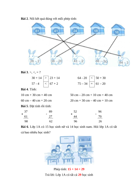 Bài 6. Lớp 1A có 15 học sinh nữ và 14 học sinh nam. Hỏi lớp 1A có tất cả bao nhiêu học sinh?