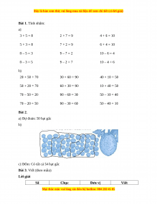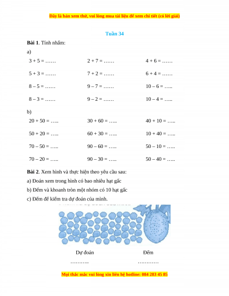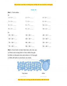 Tuần 34 Bài 1. Tính nhẩm: a) 3 + 5 = …… 2 + 7 = …… 4 + 6 = …… 5 + 3 = …… 7 + 2 = …… 6 + 4 = …… 8 – 5 = …… 9 – 7 = …… 10 – 6 = ….. 8 – 3 = …… 9 – 2 = …… 10 – 4 = ….. b) 20 + 50 = ….. 30 + 60 = ….. 40 + 10 = ….. 50 + 20 = ….. 60 + 30 = ….. 10 + 40 = ….. 70 – 50 = ….. 90 – 60 = ….. 50 – 10 = ….. 70 – 20 = ….. 90 – 30 = ….. 50 – 40 = …..