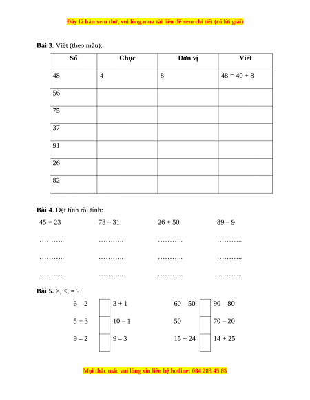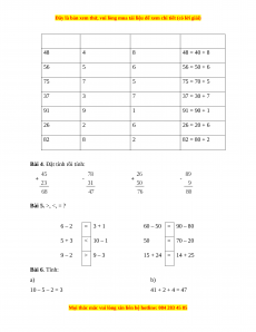 Bài 4. Đặt tính rồi tính: 45 + 23 78 – 31 26 + 50 89 – 9 ……….. ……….. ……….. ……….. ……….. ……….. ……….. ……….. ……….. ……….. ……….. ……….. Bài 5. >, <, = ? 6 – 2 3 + 1 60 – 50 90 – 80 5 + 3 10 – 1 50 70 – 20 9 – 2 9 – 3 15 + 24 14 + 25