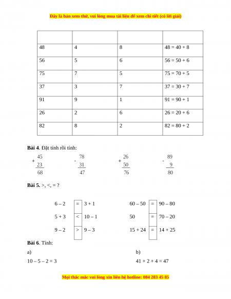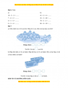 Bài 6. Tính: a) b) 10 – 5 – 2 = …… 41 + 2 + 4 = …… 7 – 4 + 2 = ……. 35 – 5 + 20 = ….. 4 + 1 + 5 = ……. 79 – 5 – 2 = …… 6 + 3 – 4 = ……. 66 – 6 + 10 = ….. Bài 7.