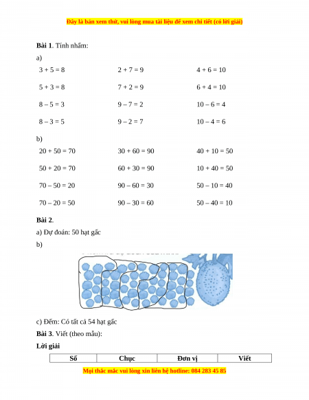 Bài 1. Tính nhẩm: a) 3 + 5 = 8 2 + 7 = 9 4 + 6 = 10 5 + 3 = 8 7 + 2 = 9 6 + 4 = 10 8 – 5 = 3 9 – 7 = 2 10 – 6 = 4 8 – 3 = 5 9 – 2 = 7 10 – 4 = 6 b) 20 + 50 = 70 30 + 60 = 90 40 + 10 = 50 50 + 20 = 70 60 + 30 = 90 10 + 40 = 50 70 – 50 = 20 90 – 60 = 30 50 – 10 = 40 70 – 20 = 50 90 – 30 = 60 50 – 40 = 10 Bài 2.