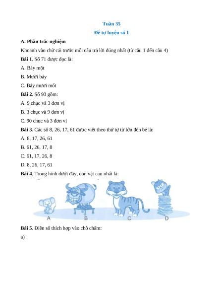Bài 1. Số 71 được đọc là: A. Bảy một B. Mười bảy C. Bảy mươi mốt Bài 2. Số 93 gồm: A. 9 chục và 3 đơn vị B. 3 chục và 9 đơn vị C. 90 chục và 3 đơn vị
