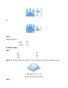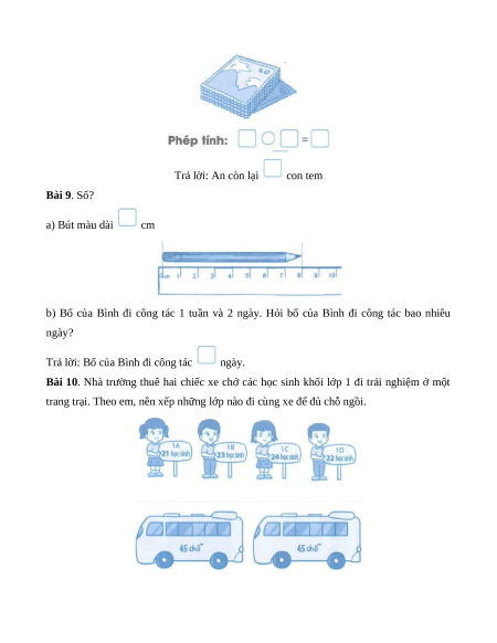 Bài 8. An có 39 con tem. An cho My 15 con tem. Hỏi An còn lại bao nhiêu con tem? Trả lời: An còn lại con tem Bài 9. Số? a) Bút màu dài cm