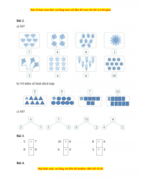 b) Vẽ thêm số hình thích hợp c) Số? Bài 3. 5 < 7 10 > 0 8 > 6 8 = 8 6 < 9 3 = 3 Bài 4.