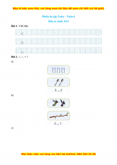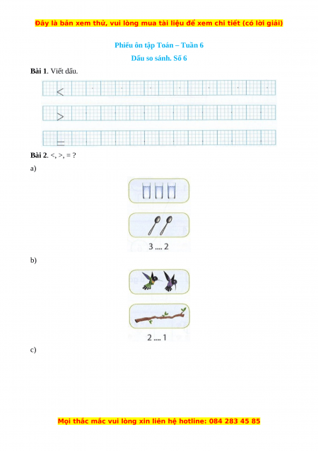 Phiếu ôn tập Toán – Tuần 6 Dấu so sánh. Số 6 Bài 1. Viết dấu. Bài 2. <, >, = ? a) b) c)