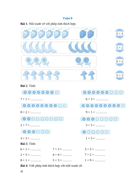 Bài 1. Nối tranh vẽ với phép tính thích hợp: Bài 2. Tính: 7 + 1 = ………… 6 + 3 = ………… 8 + 2 = ………. 9 + 1 = ……….. 2 + 7 = ……… 3 + 5 = ……… 3 + 3 = ……… 1 + 5 = ……… Bài 3. Tính: 6 + 1 = ………. 7 + 3 = ……… 5 + 5 = ………. 2 + 5 = ………. 4 + 4 = ……… 7 + 2 = ………. 8 + 1 = ………. 5 + 3 = ……… 1 + 9 = ……….