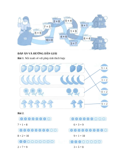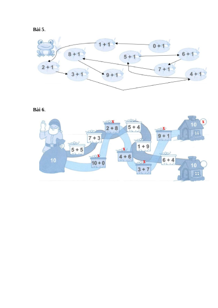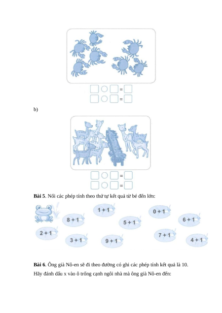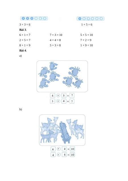 Bài 1. Nối tranh vẽ với phép tính thích hợp: Bài 2. 7 + 1 = 8 6 + 3 = 9 8 + 2 = 10 9 + 1 = 10 2 + 7 = 9 3 + 5 = 8 3 + 3 = 6 1 + 5 = 6 Bài 3. 6 + 1 = 7 7 + 3 = 10 5 + 5 = 10 2 + 5 = 7 4 + 4 = 8 7 + 2 = 9 8 + 1 = 9 5 + 3 = 8 1 + 9 = 10 Bài 4. a) b)