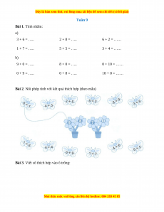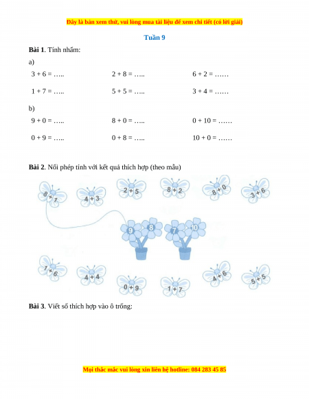 Tuần 9 Bài 1. Tính nhẩm: a) 3 + 6 = ….. 2 + 8 = ….. 6 + 2 = …… 1 + 7 = ….. 5 + 5 = ….. 3 + 4 = …… b) 9 + 0 = ….. 8 + 0 = ….. 0 + 10 = …… 0 + 9 = ….. 0 + 8 = ….. 10 + 0 = ……