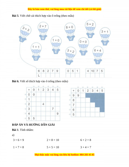 ĐÁP ÁN VÀ HƯỚNG DẪN GIẢI Bài 1. Tính nhẩm: a) 3 + 6 = 9 2 + 8 = 10 6 + 2 = 8 1 + 7 = 8 5 + 5 = 10 3 + 4 = 7