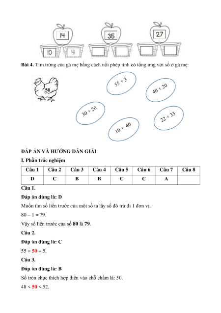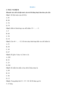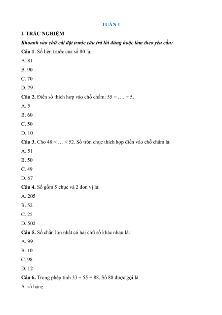 Câu 1. Số liền trước của số 80 là: A. 81 B. 90 C. 70 D. 79
