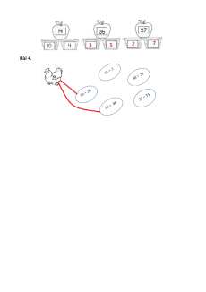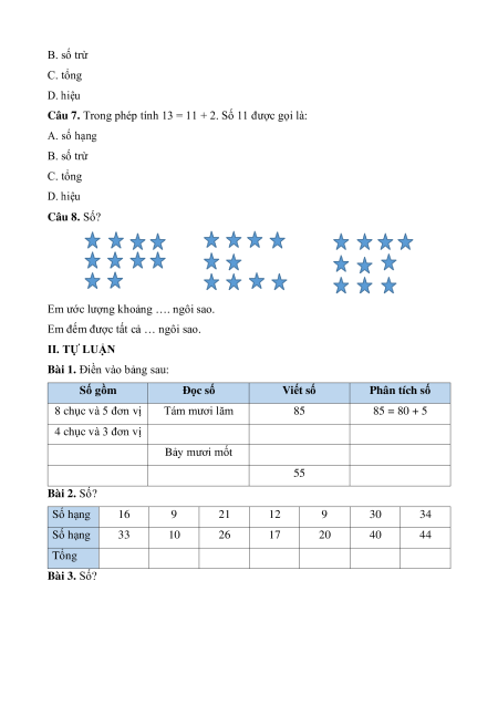 Bài 1. Điền vào bảng sau: Số gồm Đọc số Viết số Phân tích số 8 chục và 5 đơn vị Tám mươi lăm 85 85 = 80 + 5 4 chục và 3 đơn vị Bảy mươi mốt 55 Bài 2. Số? Số hạng 16 9 21 12 9 30 34 Số hạng 33 10 26 17 20 40 44 Tổng Bài 3. Số?