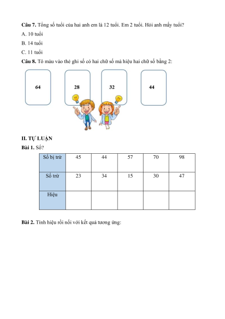 Câu 7. Trong phép tính 13 = 11 + 2. Số 11 được gọi là: A. số hạng B. số trừ C. tổng D. hiệu Câu 8. Số?