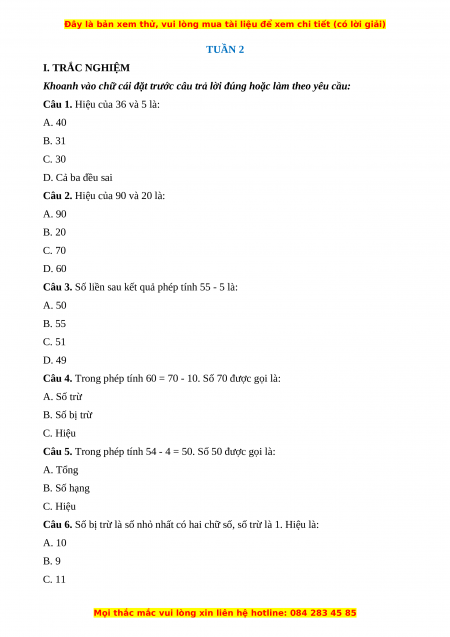 Câu 1. Hiệu của 36 và 5 là: A. 40 B. 31 C. 30 D. Cả ba đều sai
