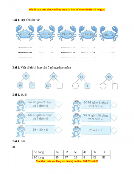 Bài 2. Viết số thích hợp vào ô trống (theo mẫu) Bài 3. Đ, S? Bài 4. Số? a) Số hạng 24 32 50 41 36 14 Số hạng 15 67 29 8 42 53