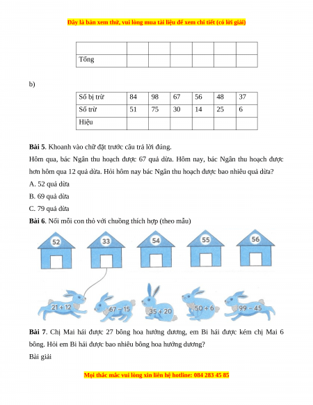 Bài 7. Chị Mai hái được 27 bông hoa hướng dương, em Bi hái được kém chị Mai 6