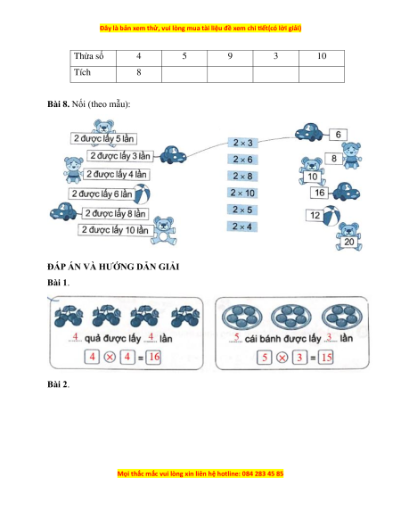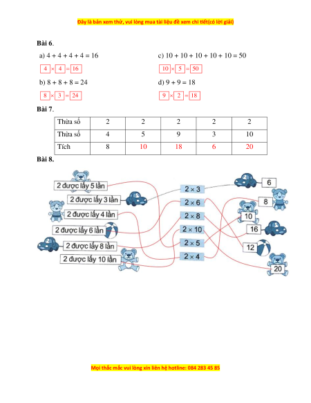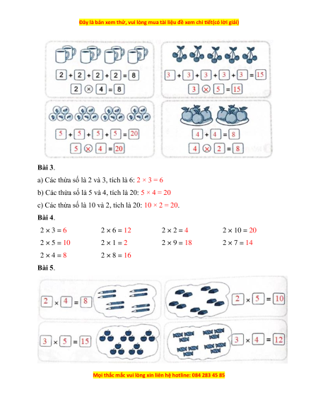 c) Các thừa số là 10 và 2, tích là 20: 10 × 2 = 20. Bài 4. 2 × 3 = 6 2 × 6 = 12 2 × 2 = 4 2 × 10 = 20 2 × 5 = 10 2 × 1 = 2 2 × 9 = 18 2 × 7 = 14 2 × 4 = 8 2 × 8 = 16 Bài 5.