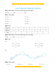 5; 10; ….; ….; 25; …; ….; ….; ….; ….. Bài 5. Số? a) 2 × = 4 5 × = 15 2 × = 12 5 × = 30 b) Bài 6. Tính nhẩm 2 × 3 = …. 2 × 4 = …. 5 × 2 = …. 5 × 7 = ….