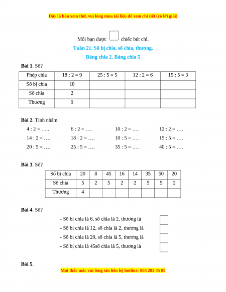 Bảng chia 2. Bảng chia 5 Bài 1. Số? Phép chia 18 : 2 = 9 25 : 5 = 5 12 : 2 = 6 15 : 5 = 3 Số bị chia 18 Số chia 2 Thương 9 Bài 2. Tính nhẩm 4 : 2 = ….. 6 : 2 = …. 10 : 2 = …. 12 : 2 = …. 14 : 2 = …. 18 : 2 = …. 10 : 5 = …. 15 : 5 = …. 20 : 5 = …. 25 : 5 = …. 35 : 5 = …. 40 : 5 = …. Bài 3. Số? Số bị chia 20 8 45 16 14 35 50 20 Số chia 5 2 5 2 2 5 5 2 Thương 4 Bài 4. Số?