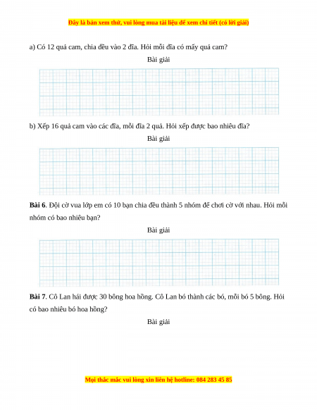 Bài 7. Cô Lan hái được 30 bông hoa hồng. Cô Lan bó thành các bó, mỗi bó 5 bông. Hỏi có bao nhiêu bó hoa hồng? Bài giải