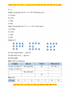 Câu 6. Trong phép tính 33 + 55 = 88. Số 88 được gọi là: A. số hạng B. số trừ C. tổng D. hiệu