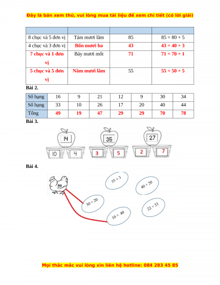 Bài 1. Điền vào bảng sau: Số gồm Đọc số Viết số Phân tích số 8 chục và 5 đơn vị Tám mươi lăm 85 85 = 80 + 5 4 chục và 3 đơn vị Bảy mươi mốt 55 Bài 2. Số? Số hạng 16 9 21 12 9 30 34