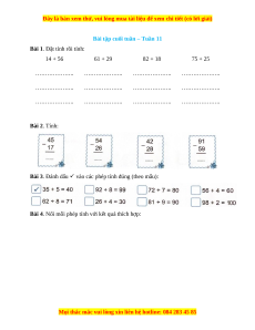 Bài 1. Đặt tính rồi tính: 14 + 56 61 + 29 82 + 18 75 + 25 ……………….. ……………….. ……………….. ……………….. ……………….. ……………….. ……………….. ……………….. ……………….. ……………….. ……………….. ……………….. Bài 2. Tính: