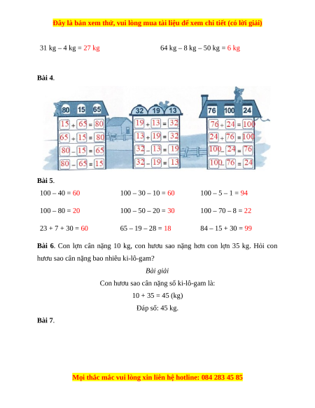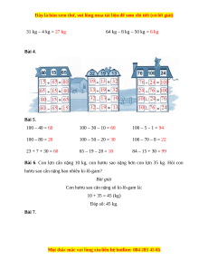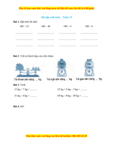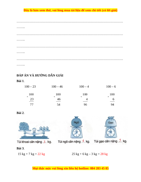 ĐÁP ÁN VÀ HƯỚNG DẪN GIẢI Bài 1. 100 – 23 100 – 46 100 – 4 100 – 6 Bài 2. Bài 3. 15 kg + 7 kg = 22 kg 25 kg + 6 kg – 3 kg = 28 kg